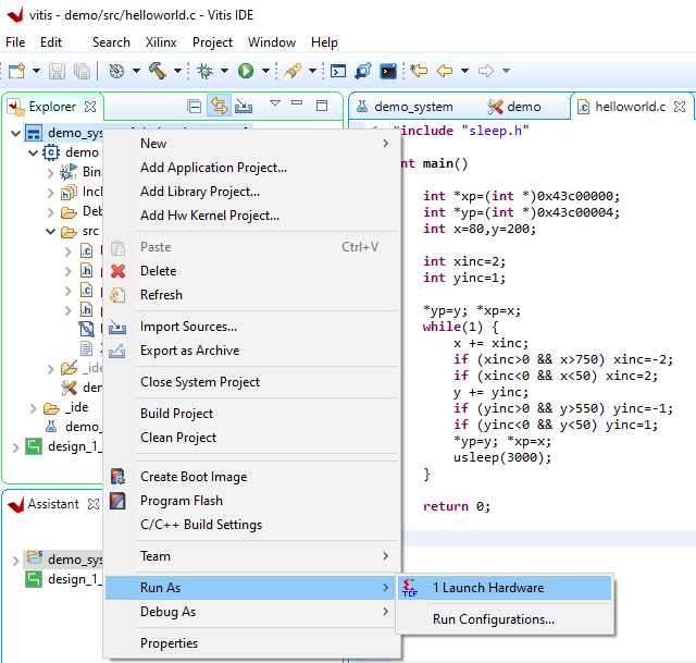 Ko aplikacijo prevedemo, jo naložimo na razvojni sistem z Run As > Launch Hardware